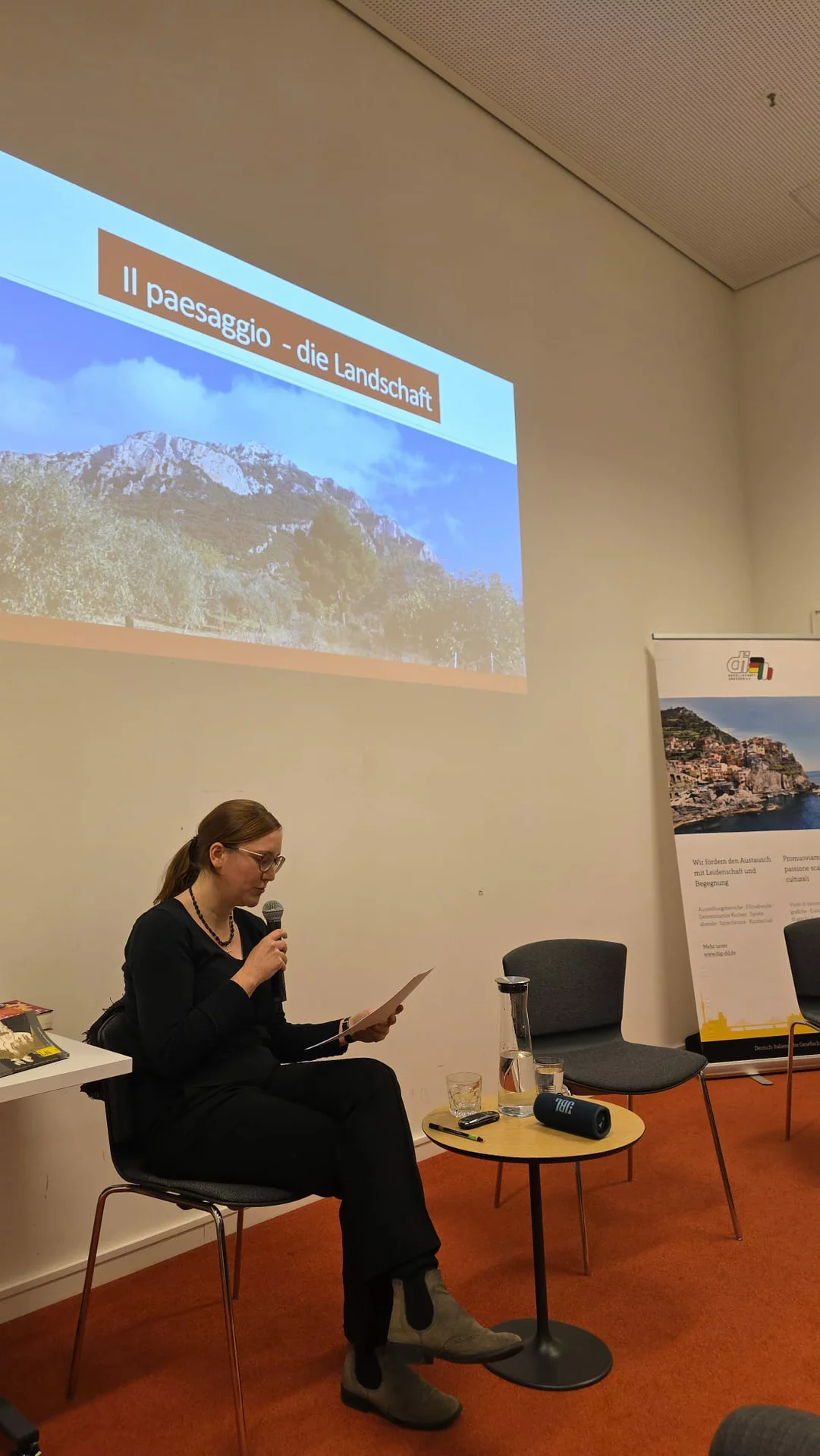 Maike Heber ha guidato il pubblico con agilità dal tedesco all’italiano e viceversa. Con una digressione personale ha collegato alcuni passaggi al tema della Giornata internazionale dei diritti delle donne. I testi proiettati alle spalle hanno permesso a tutti di seguire la narrazione.